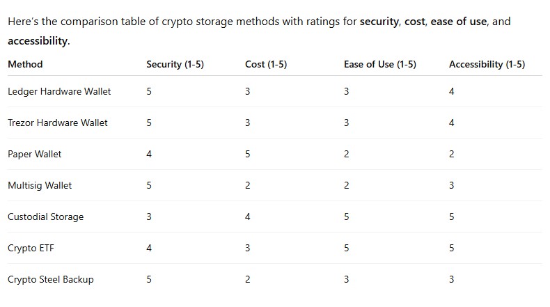 • Long-Term Cold Storage: Paper wallet or hardware wallet in a safe, with seed on crypto steel.