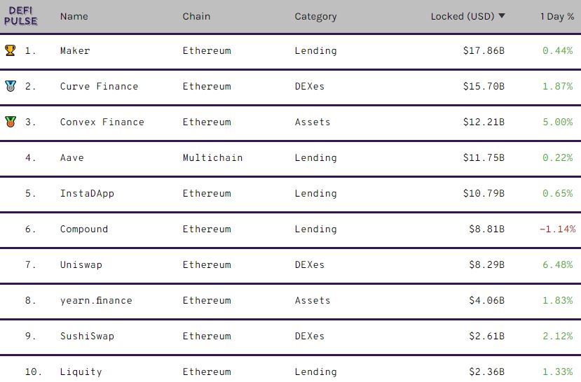 When the first data has been consulted, there is the possibility of providing a detailed view of the actual rating of the best DeFi projects. The ranking is calculated on the basis of the liquidity blocked by each protocol, as explained above, and the data given to us for each project are: